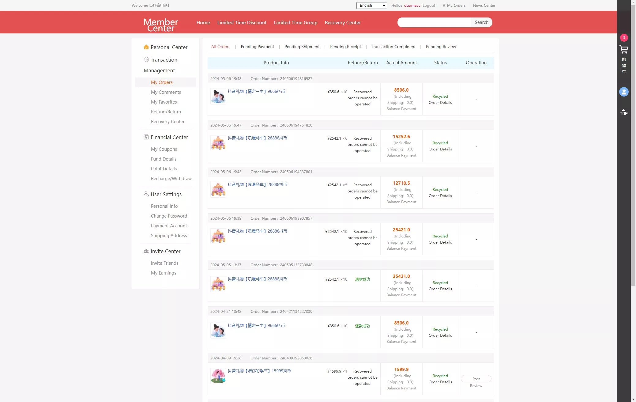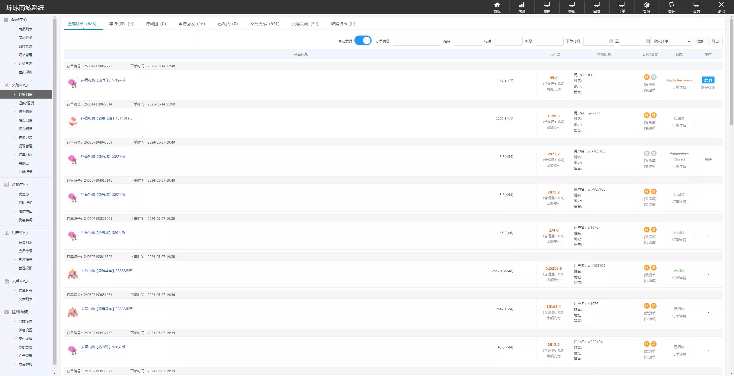 用户在前端完成下单购买后,后台订单可直接进行自动化回收处理,实现资金流的高效运转。