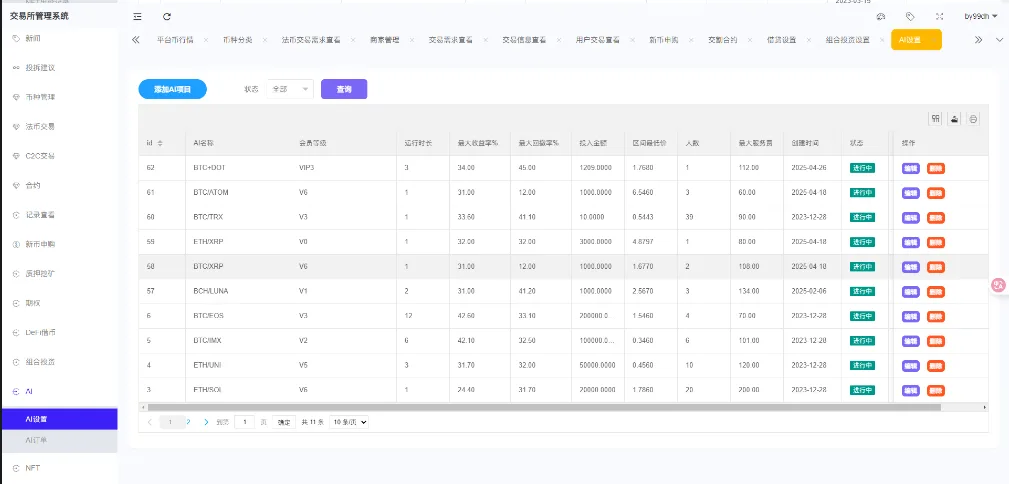 数字资产交易、投资理财、借贷、杠杆 币币交易 合约交易 期权交易 C2C AI量化理财 双币理财 VIP等级系统 钱包功能 DeFi理财 币种理财(定期存款)借贷系统 跟单系统 保险系统 微交易 新闻资讯 邀请返佣 站内信系统 多种支付系统 糖果转账 机器人管理 风险控制 价格k线预设 委托 等等众多功能